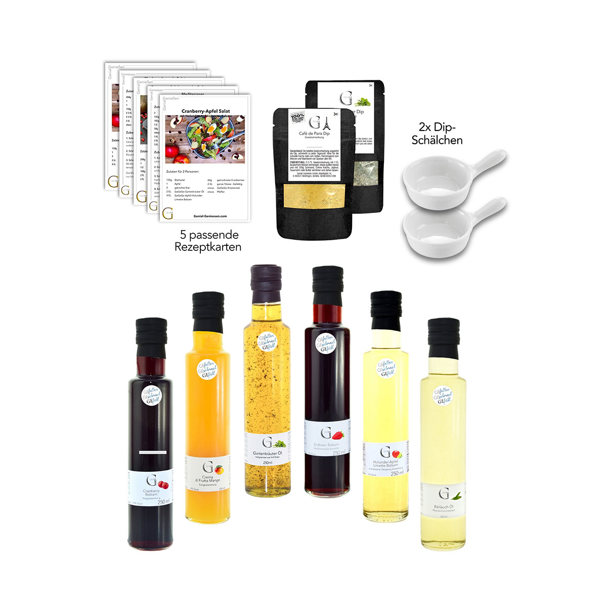 Das Bärlauch auf Traubenkernöl und das Gartenkräuteröl verleihen frischen Zutaten eine würzige, natürliche Tiefe, während Mango Crema, Erdbeer Crema und Cranberry Balsam für eine harmonische Balance aus Frucht und Eleganz sorgen. Der Apfel-Holunder-Limette Balsam bringt eine erfrischende, blumige Note ins Spiel - perfekt für leichte Frühlingsgerichte. Mit den beiden Dip-Gewürzen Gartenkräuter und Café de Paris lassen sich im Handumdrehen köstliche Dips zaubern, die jedes Essen abrunden. Die passenden Dip-Schälchen und fünf inspirierende Rezeptkarten machen das Set komplett und laden dazu ein, sofort loszulegen.
