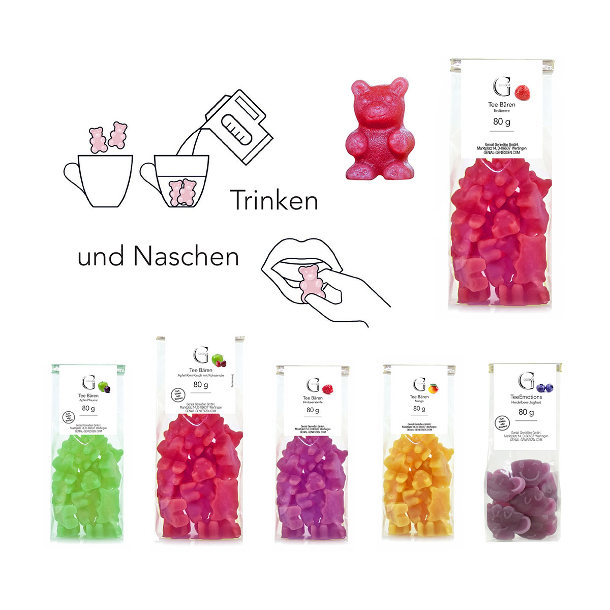 Was für eine geniale Idee! Genieße diese Fruchtgummi Tee Bären mit fruchtig-exotischem Mango-Geschmack als herrlich-leckeres Heiß- & Kaltgetränk oder vernasche sie einfach so.