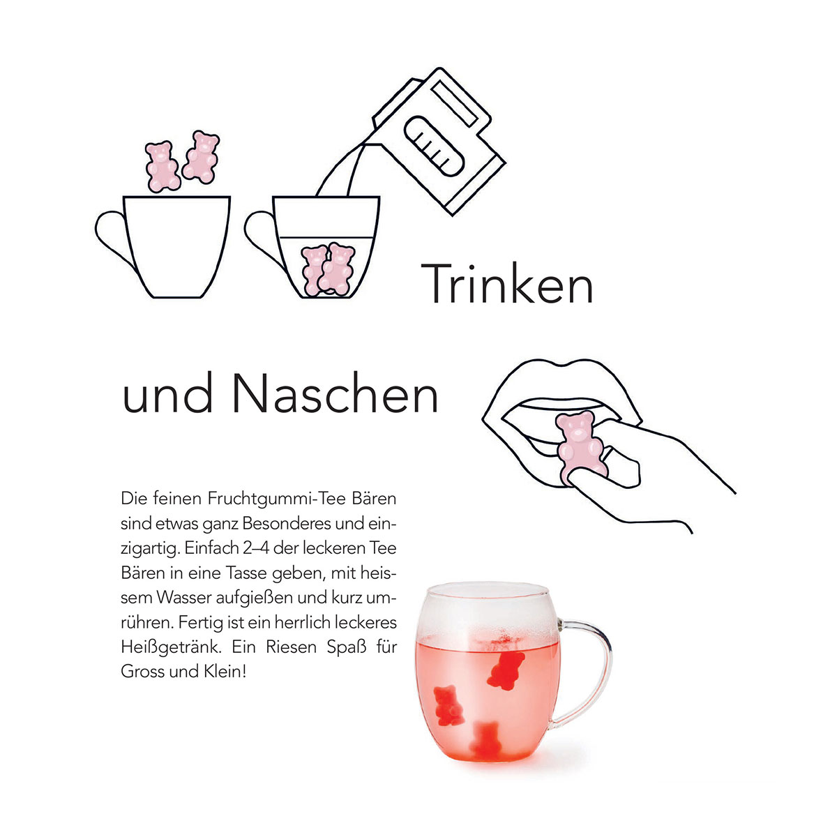 • als Tee-Genuss: 1 - 2 Tee Bären in eine Tasse geben, mit heißem Wasser aufgießen, umrühren & genießen