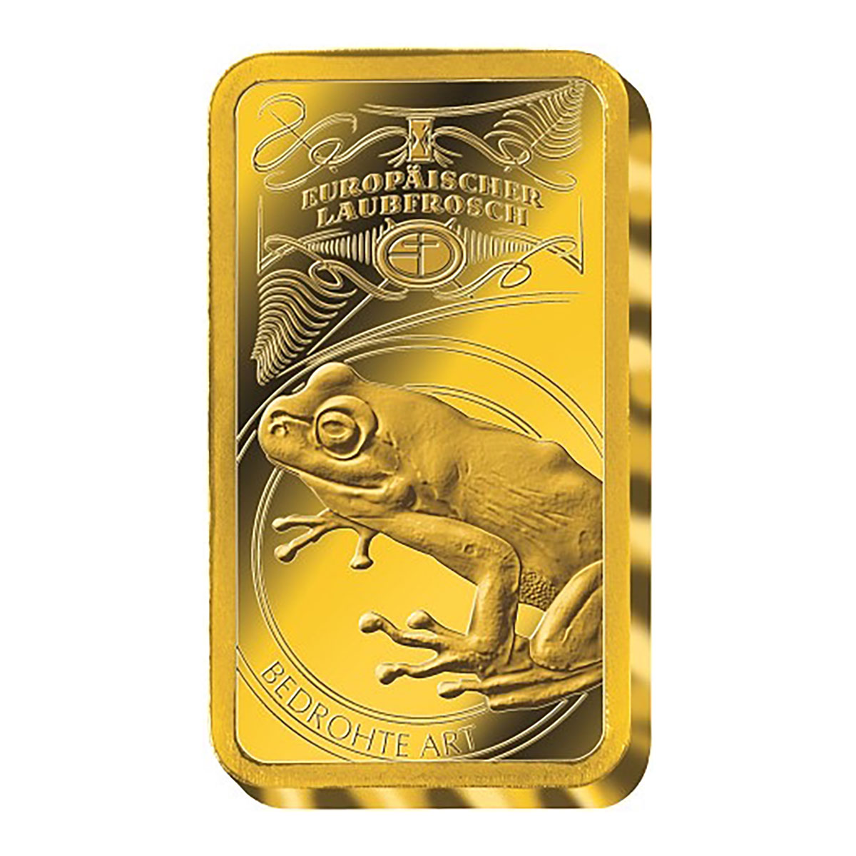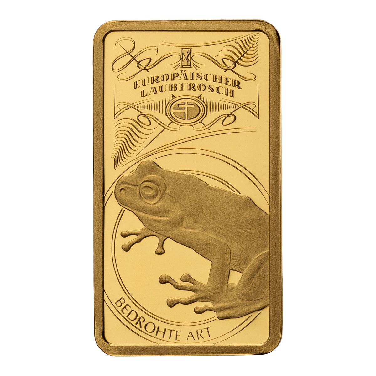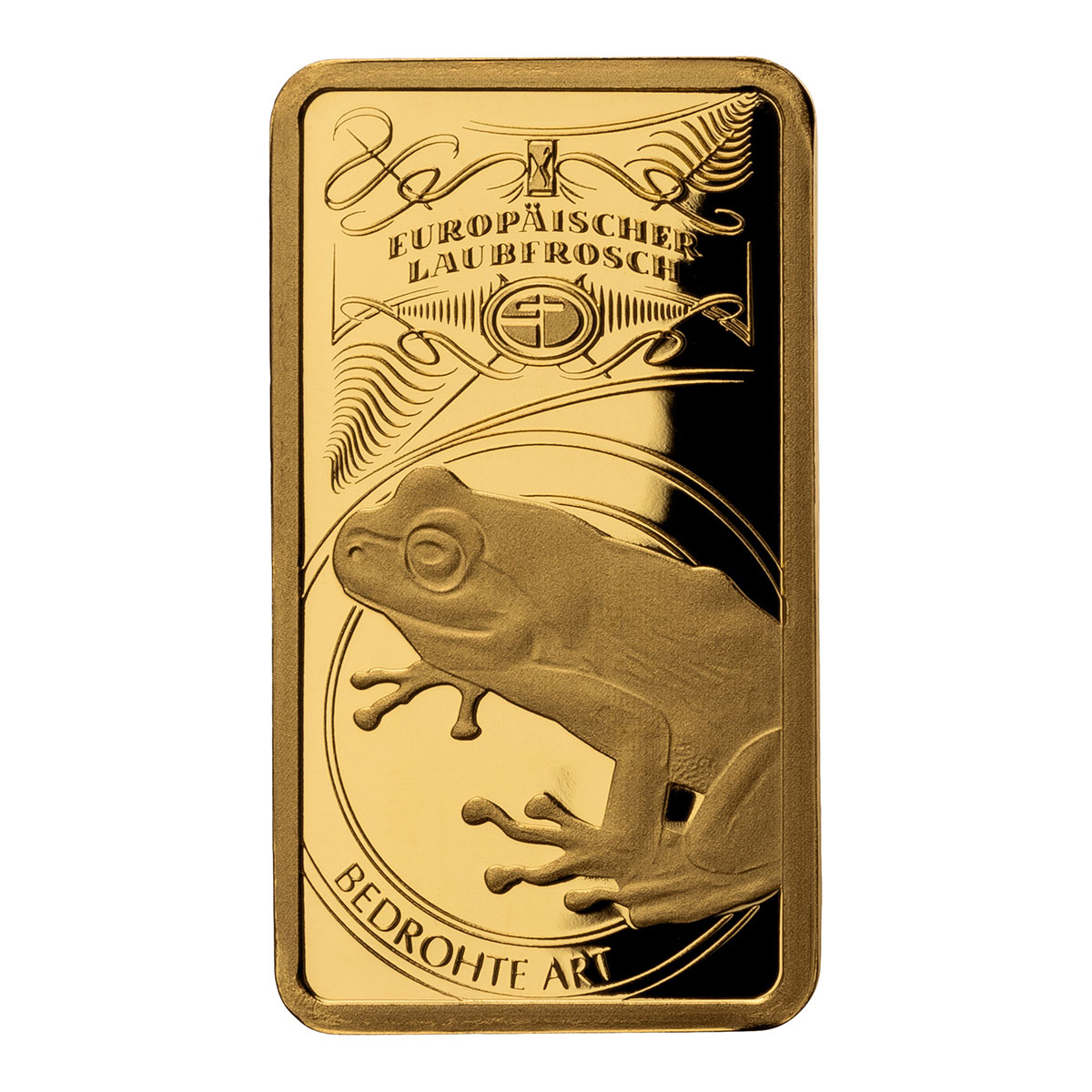 Mit dieser filigranen Gedenkprägung wird dem Laubfrosch ein Denkmal gesetzt. Als Symbol für den Schutz bedrohter Arten ist er auf einem Goldbarren aus reinstem .