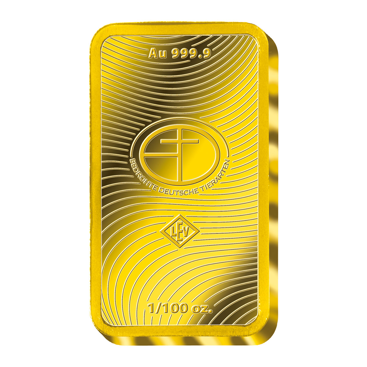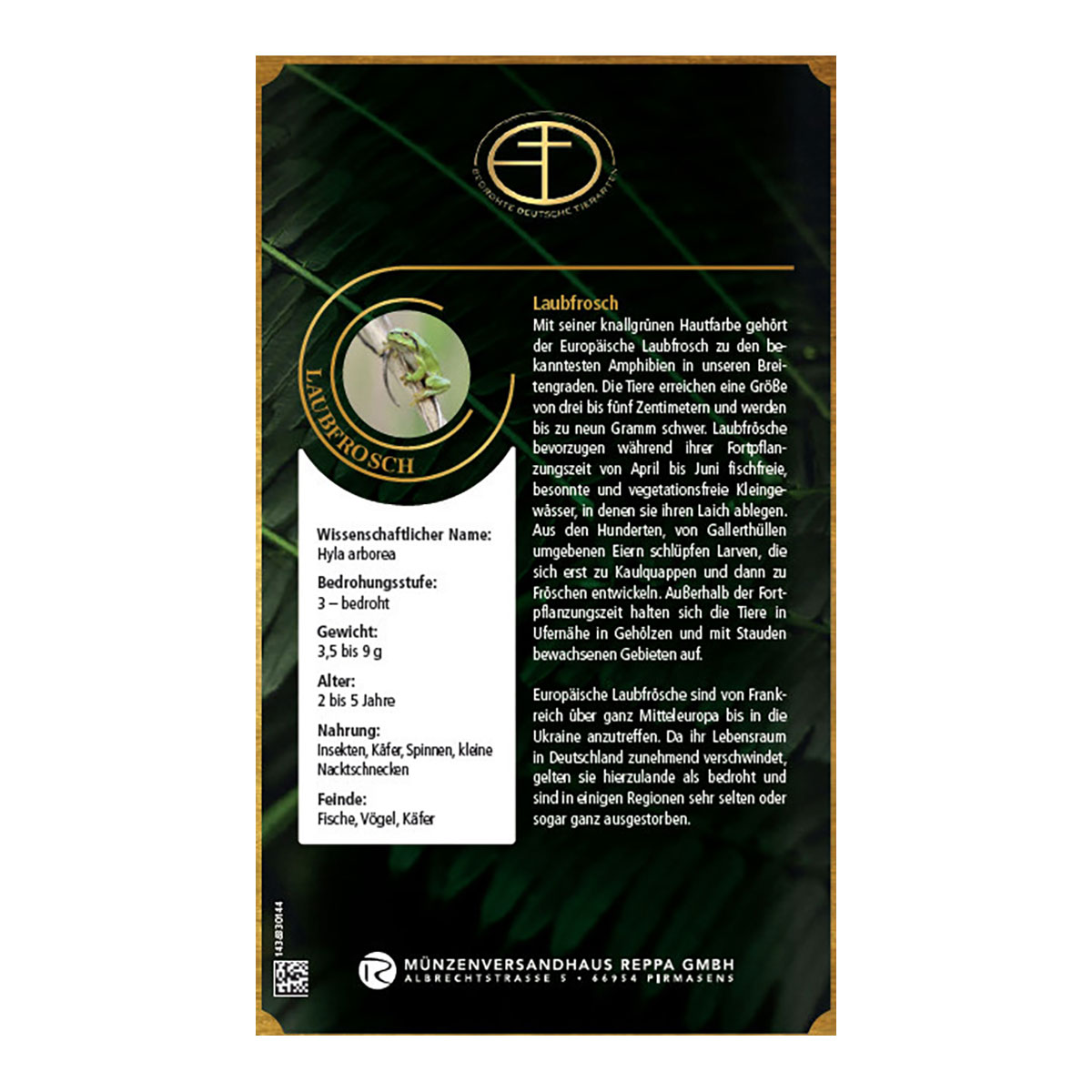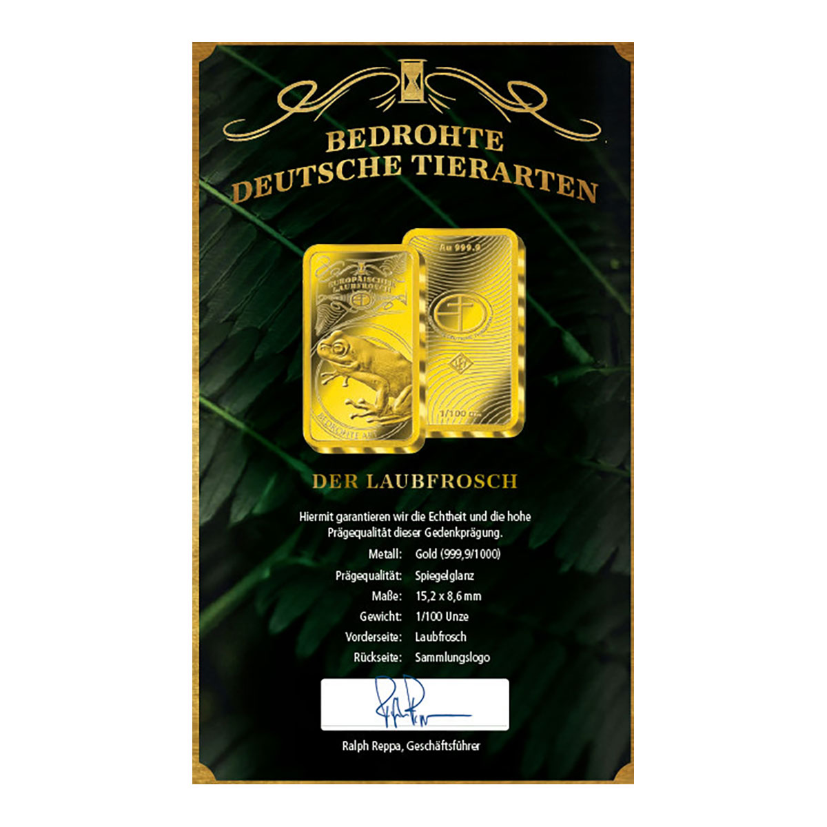 Mit dieser filigranen Gedenkprägung wird dem Laubfrosch ein Denkmal gesetzt. Als Symbol für den Schutz bedrohter Arten ist er auf einem Goldbarren aus reinstem .
