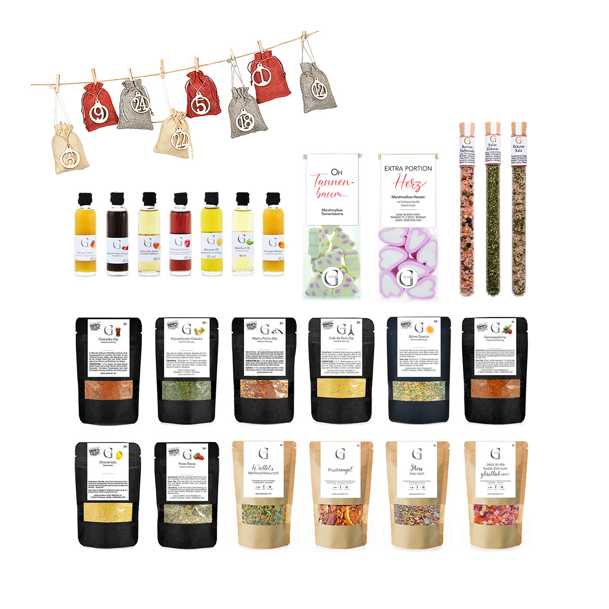 Mit 24 kleinen Seelengenüssen für jeden Adventstag kommt garantiert Weihnachtsstimmung bei deiner Herz-Allerliebsten auf! Jeden Tag etwas Feines zum Genießen und Entspannen: Leckere Essige und Öle, Dips & Gewürze, weihnachtlicher Tee und Süßes für Feinschmecker. Zaubere mit diesen Überraschungen jeden Tag ein Lächeln ins Gesicht deiner Frau oder deiner Freundin!