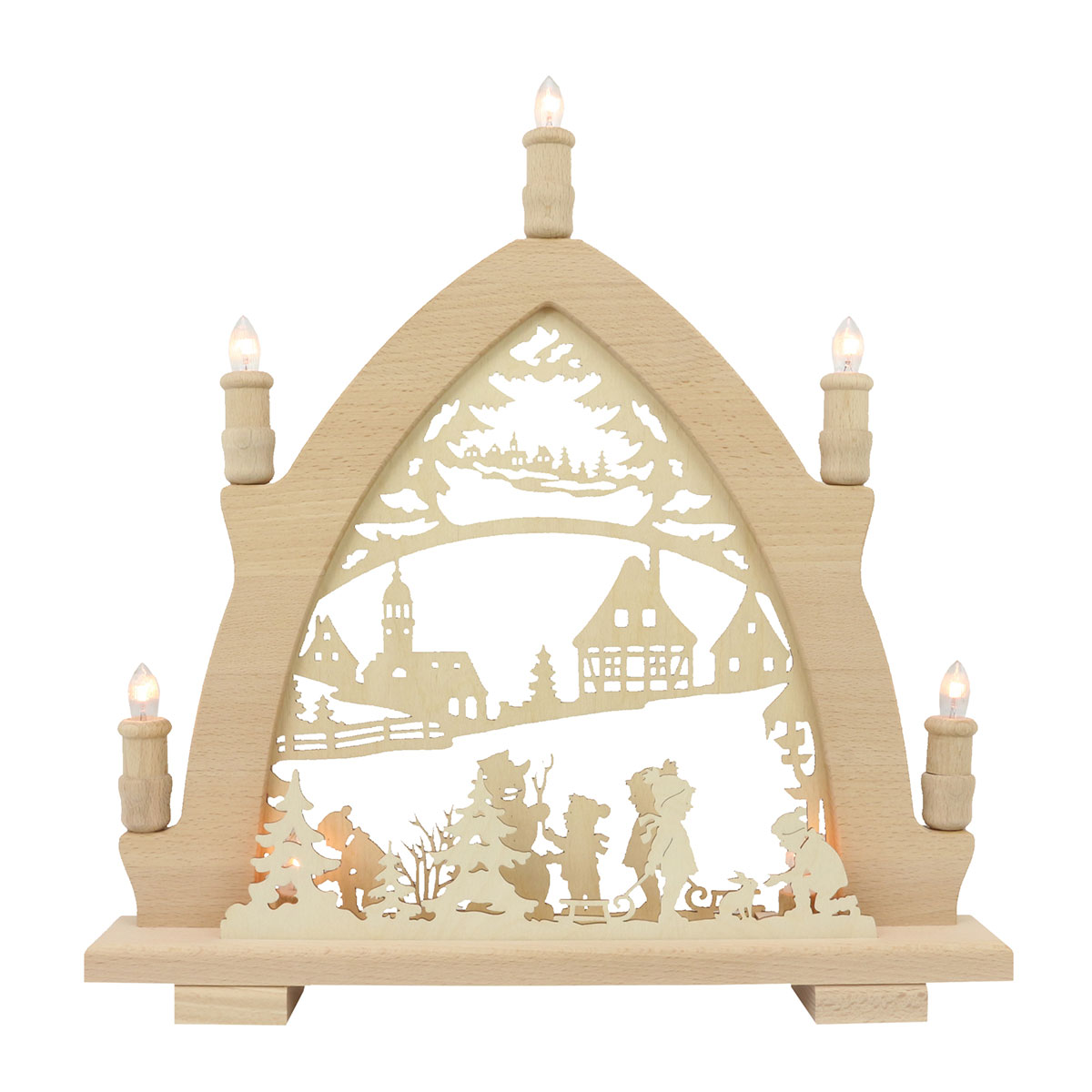 Dieser filigran gearbeitete Leuchter ist weit mehr als nur eine Lichtquelle - er ist ein Ausdruck von Wärme, Geborgenheit und traditioneller Handwerkskunst. Jeder einzelne Bogen wurde mit Liebe zum Detail aus hochwertigem Buchenholz gefertigt - natürlich, beständig und zeitlos schön. Stimmungsvolles Licht für gemütliche Stunden Dank der dezenten indirekten Beleuchtung im Sockel entsteht ein besonders weiches Lichtspiel, das jeden Raum in eine behagliche Atmosphäre taucht.