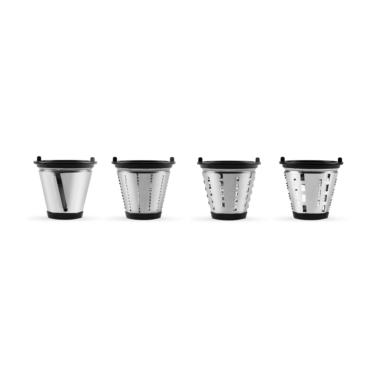 - 4 Acid-Etched Einsätze: Scheiben, große Julienne, kleine Julienne und Raspeleinsatz